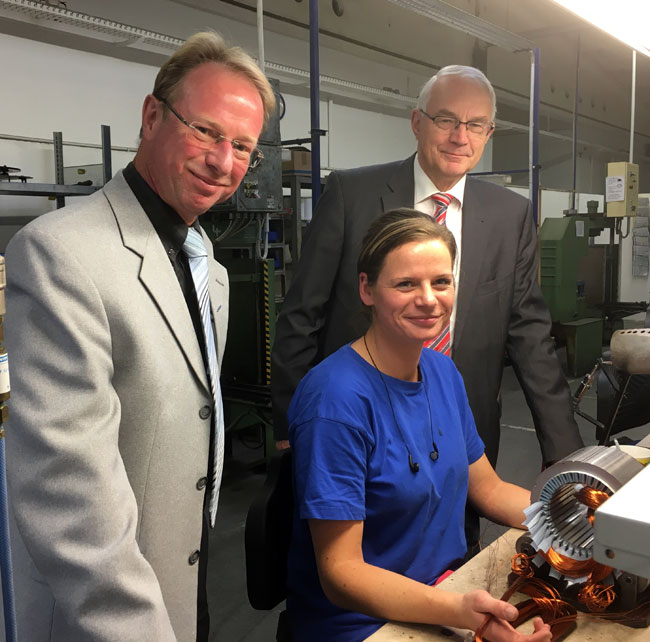 In der Motorenwicklung: Geschäftsführer Herr Leidel, Mitarbeiterin Frau Günzel,