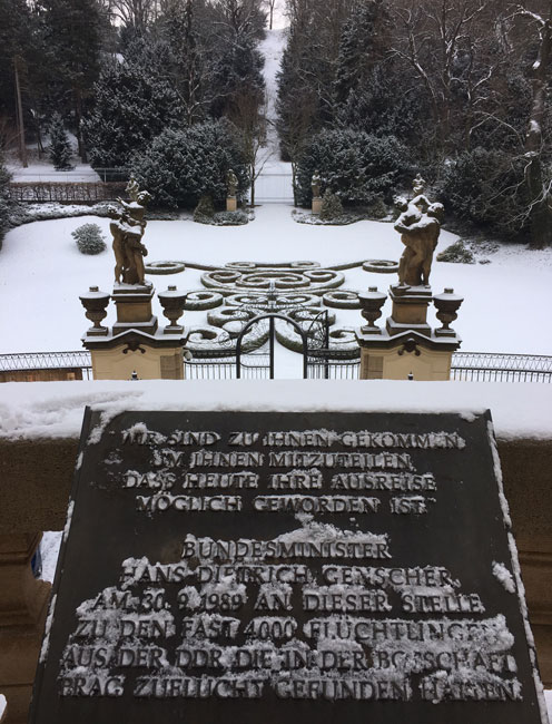 Der 1989 bekanntgewordene Balkon der Deutschen Botschaft in Prag