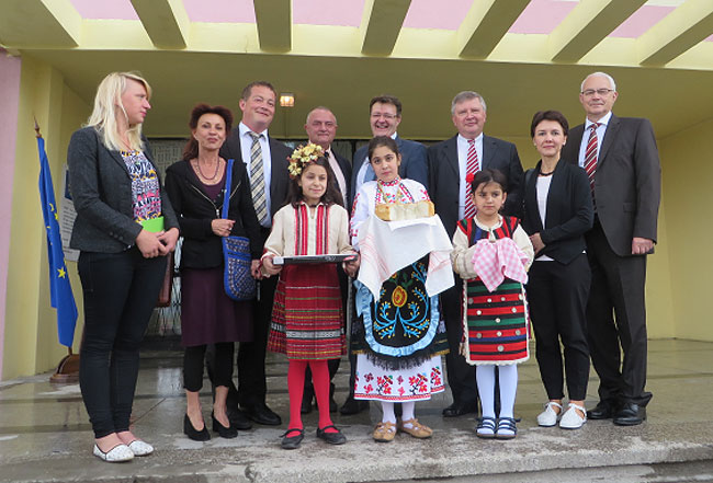 Empfang der Delegation im Flüchtlingslager in Sofia, landestypisch mit Brot und