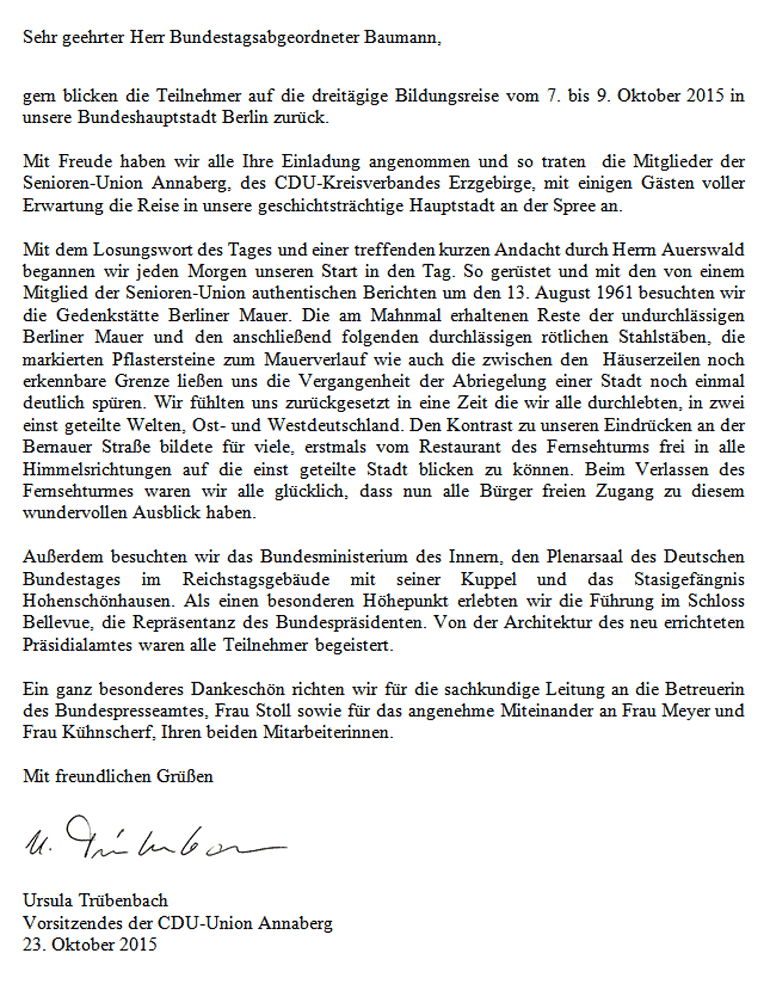In der Zeit vom 7. bis 9. Oktober 2015 verbrachte die Senioren-Union Annaberg, des CDU-KV Erzgebirge, auf Einladung des Bundestagsabgeordneten Günter Baumann drei interessante Tage in unserer Bundeshauptstadt Berlin.