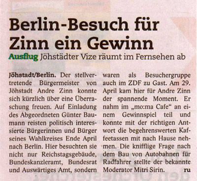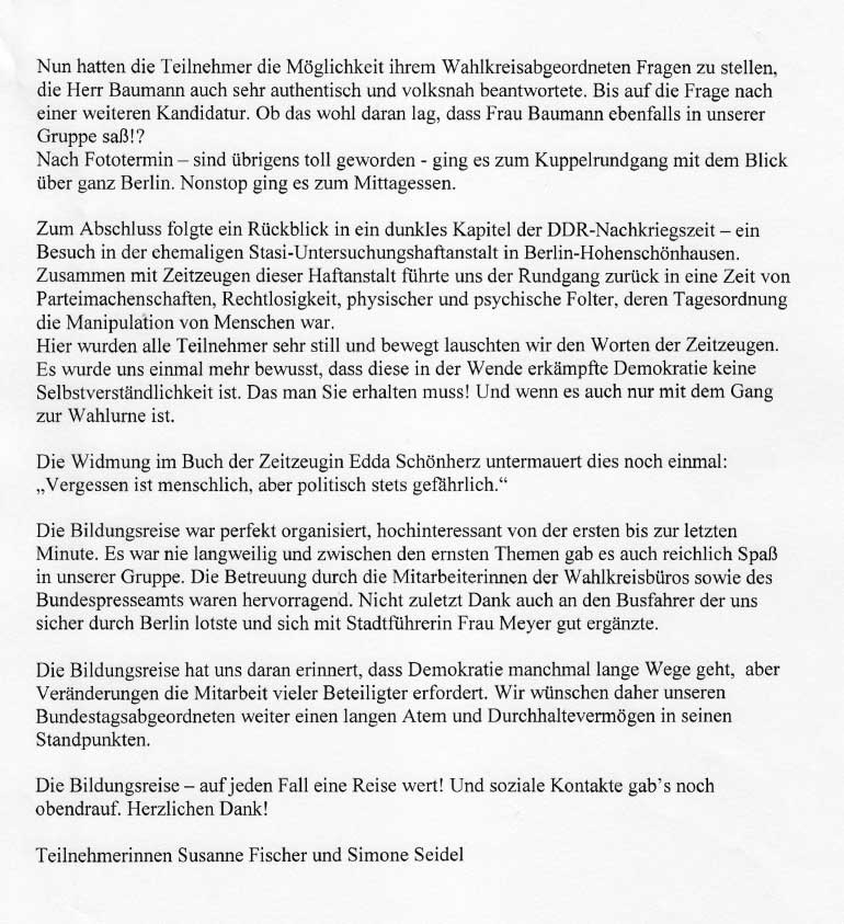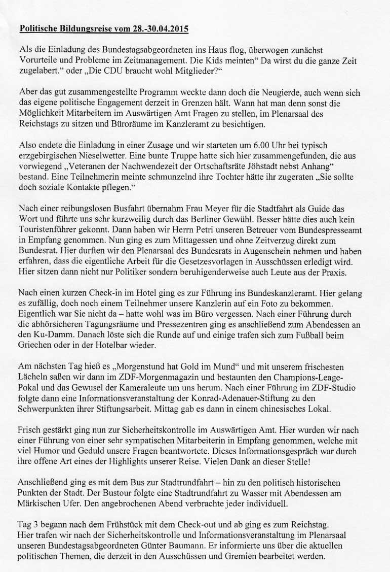 Baumann seine Einladung zur Bildungsreise vom 28. bis 30. April 2015 zum