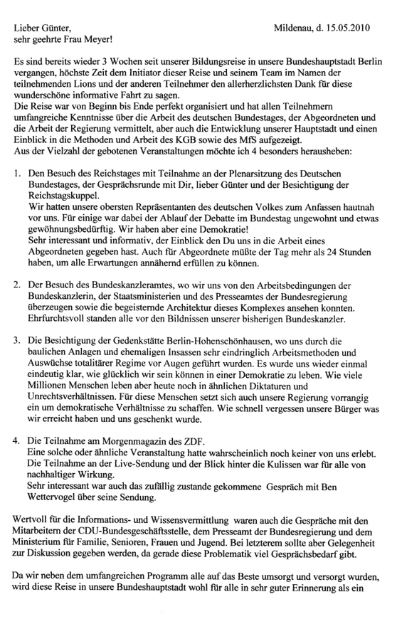 Ein Brief von Jürgen Horn zur Bildungsreise nach Berlin